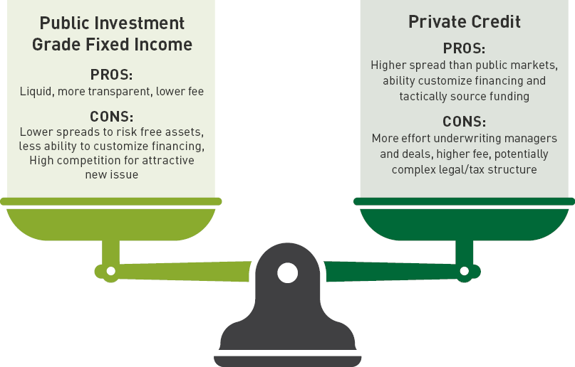 In this article, we discuss the opportunities and challenges associated with building well-balanced portfolios of private credit investments and fixed income investments available in public markets.