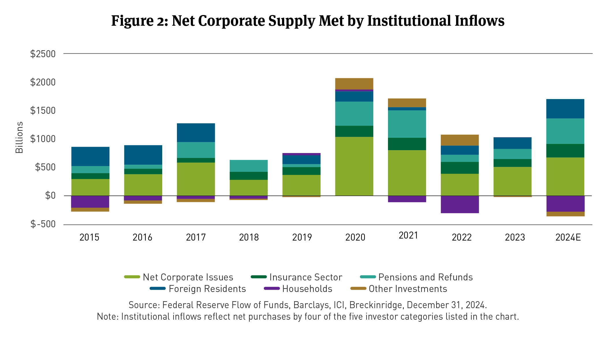 Taxable bond fund inflows, per the ICI were $440 billion in 2024. Net supply of $675 billion exceeded inflows but non-U.S. investors and insurance inflows were also elevated sustaining demand for IG credit.