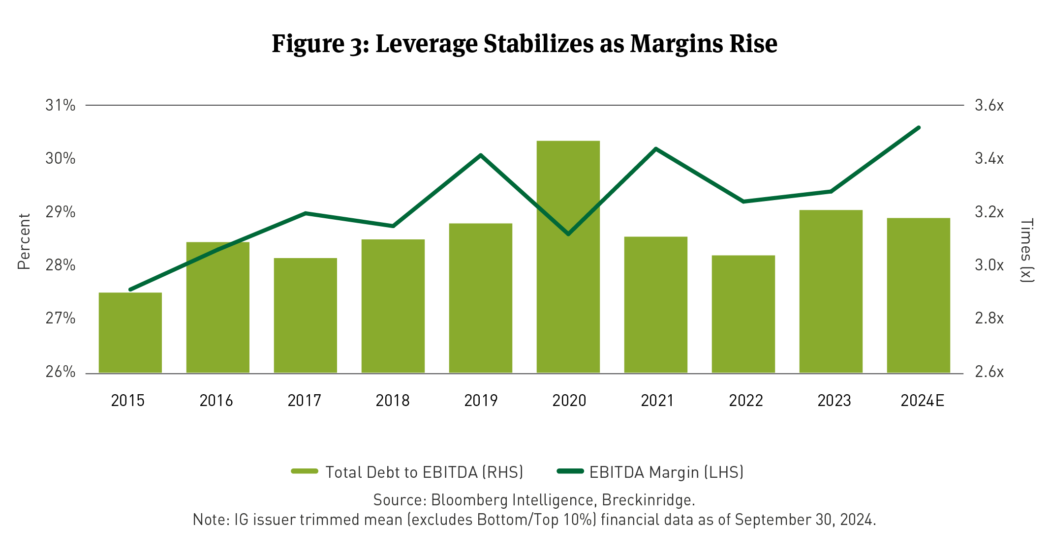 [3] Bloomberg Intelligence. Note: IG issuer trimmed mean (Bottom/Top 10%) financial data as of 9/30/24.