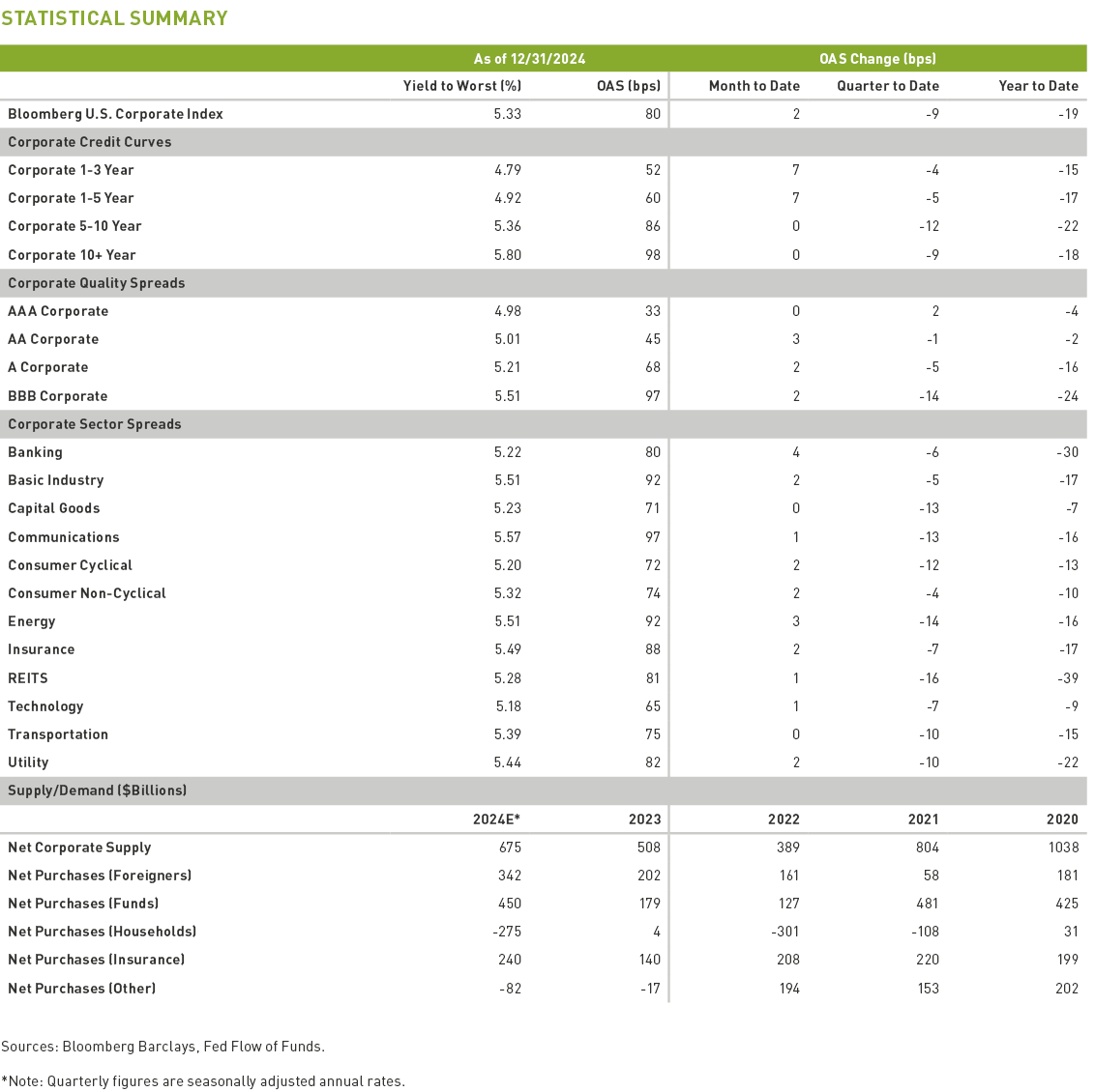 Corporate spreads were 9bps and 19bps tighter in 4Q24 and FY24, respectively, closing at an OAS of 80bps, per Bloomberg.