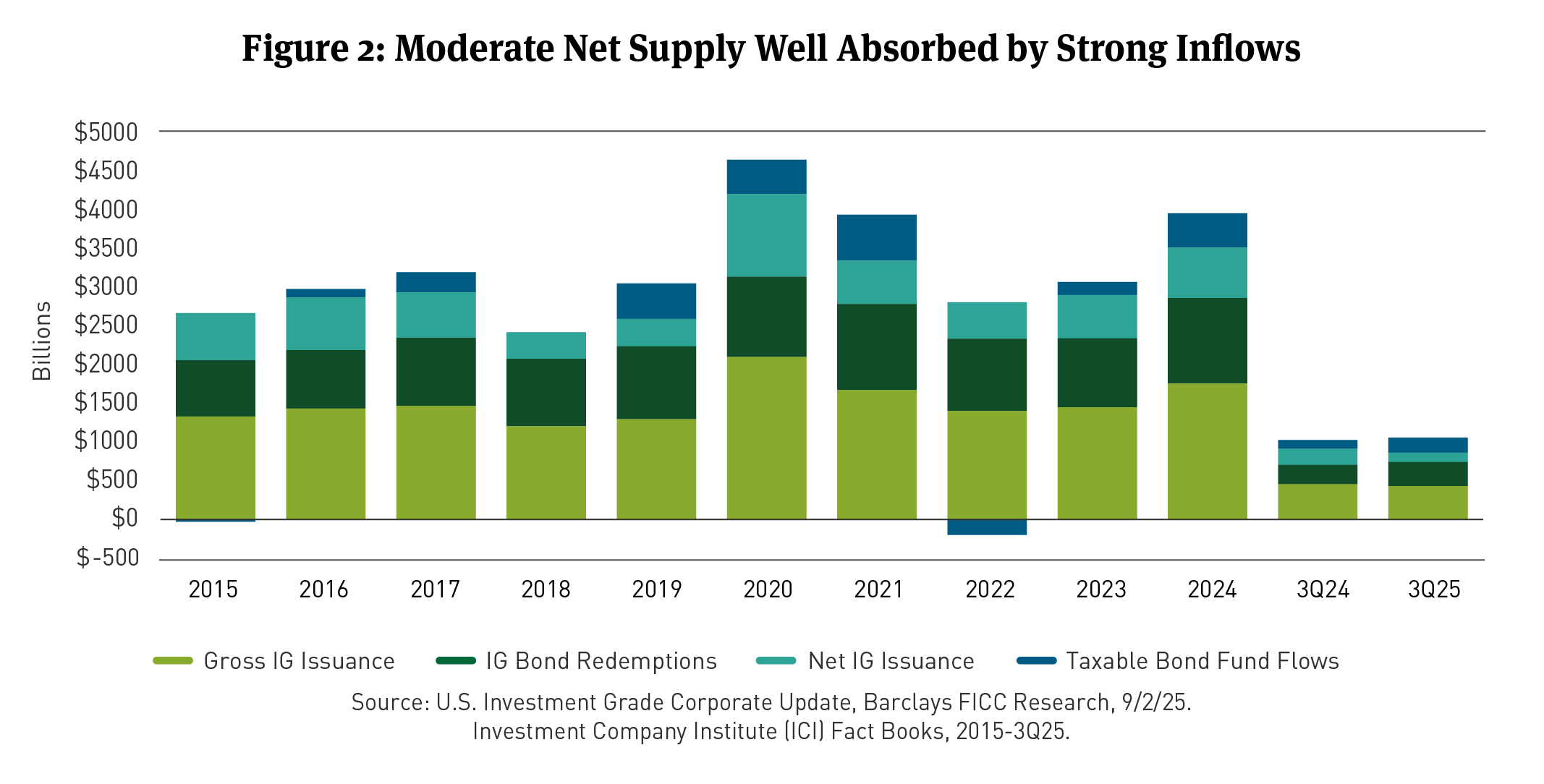 IG gross supply was $433 billion in 3Q25, down 5 percent Y/Y. On a net basis after maturities, issuance was $121 billion. We think strong corporate bond issuance can continue. Lower interest rates should help drive incremental supply, with all-in yields near the lowest level in three years. At a record $226 billion, the deluge of supply in September speaks to pent-up demand for credit, with abnormally low net supply in recent months and continued strong flows from funds and foreign investors. Inflows into long-term, taxable bond funds and ETFs remained healthy at about $193 billion in 3Q25.16