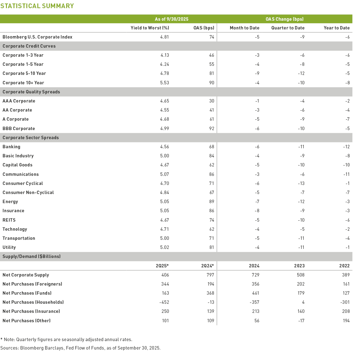 It was a record September with $226 billion of new IG corporate bonds priced but even with that, net issuance ended the third quarter at a manageable $121 billion, solidifying the favorable technical backdrop. The Federal Reserve (Fed) rate cut in mid-September seemed to accelerate issuance and less restrictive monetary policy should encourage more borrowing. Credit markets, particularly IG, have seen spreads and yields pushed lower, as robust flows into fixed income continued to absorb new issue supply rather easily. Inflows into long-term, taxable bond funds and ETFs remained healthy at about $193 billion in 3Q25.10 Foreign investor corporate bond purchases were $92 billion for the three months through July, per Treasury International Capital (TIC) data.11 For the 12 months through July, 2025, net foreign purchases of corporate bonds were $309 billion, compared to $261 billion for the same period in 2025, indicating demand is strong and has risen.12 Foreign buying of corporates has been sticky over the last few years and has helped offset some of the variability in domestic fund flows.