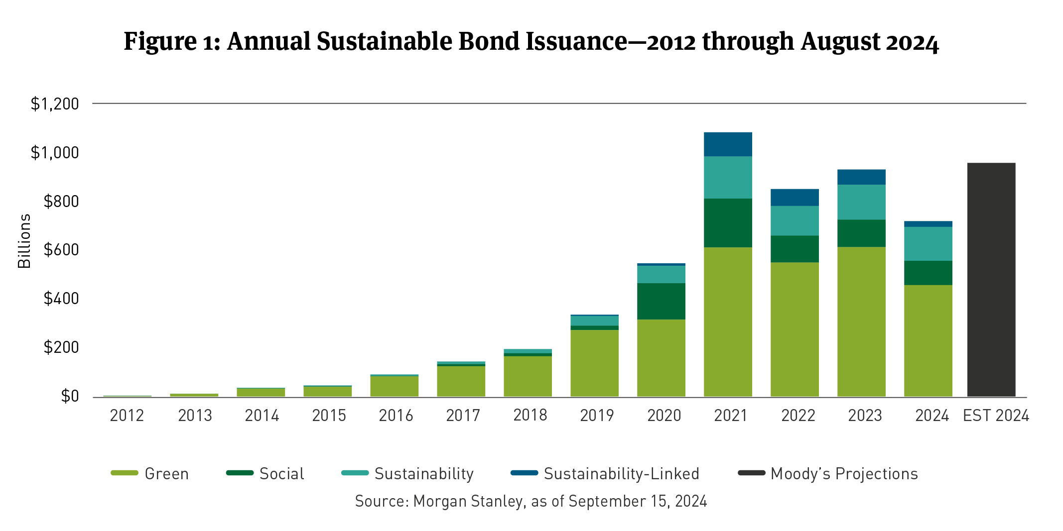 Sustainable bond supply from U.S.-based corporate issuers of $224 billion through August 2024 is 0.6 percent lower than the same period in 2023, per Barclays. Sustainable bond supply in the municipal market during the same period did not keep pace with the rest of the municipal market, although sustainable muni issuance was up year over year. Some parts of the securitized market saw sustainable bond increases, while increases overseas were more broadly distributed across sectors.