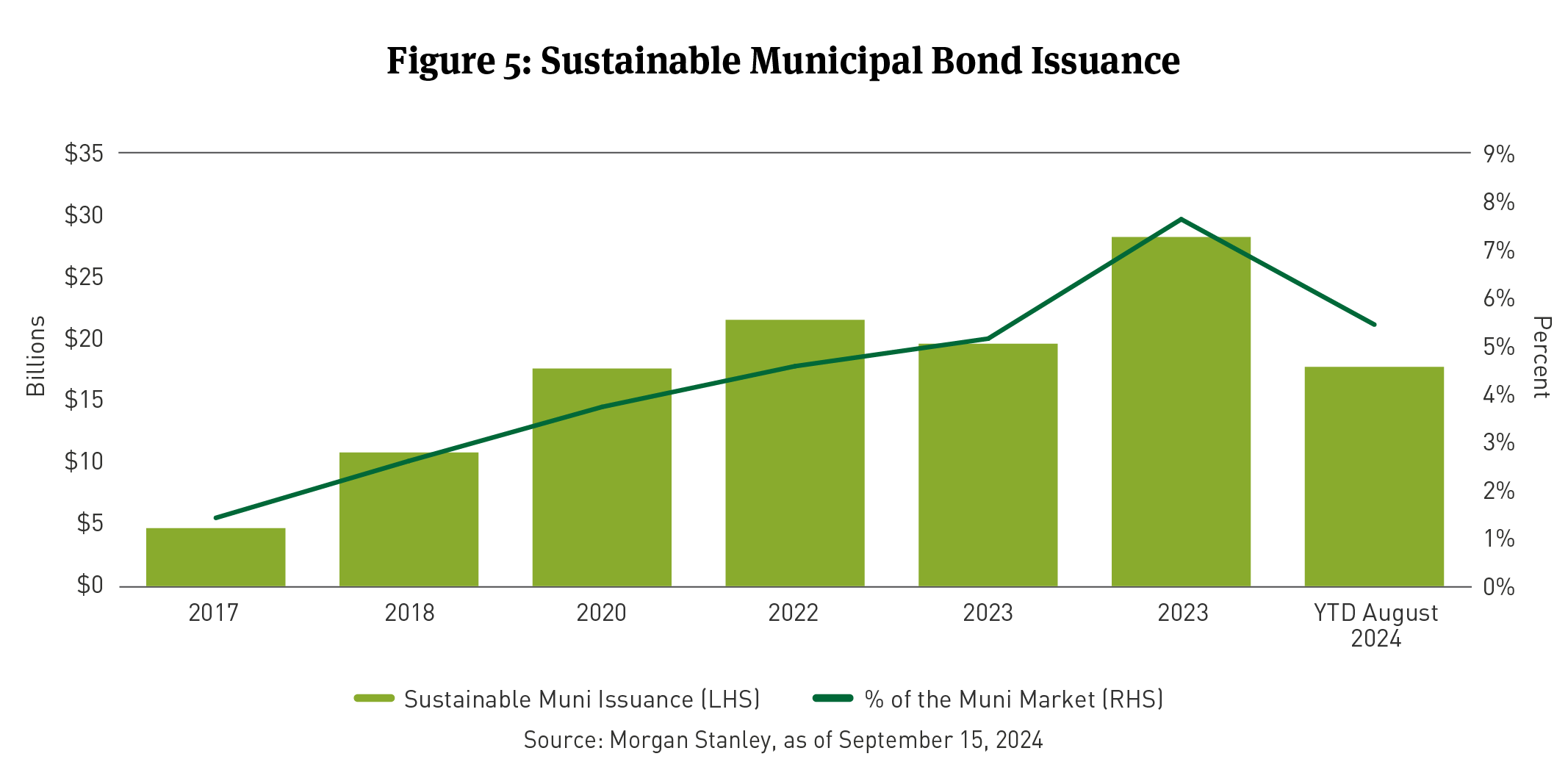 Municipal: Total municipal bond issuance of about $334.6 billion YTD through August 31, according to The Bond Buyer, which was more than 34 percent higher than $249 billion issued in the same period last year. Sustainable supply did not keep pace with the rest of the municipal market, with Morgan Stanley reporting that $18.2 billion of sustainable municipal bonds were issued through August and sustainable issuance as a share of the total declining to 5.4 percent, less than 2023's share of 7.6 percent. If issuance continues this pace for the remainder of 2024, it would be the first year in five years that municipal sustainable bond issuance as a percentage of the total municipal market did not increase. (See Figure 5.)
