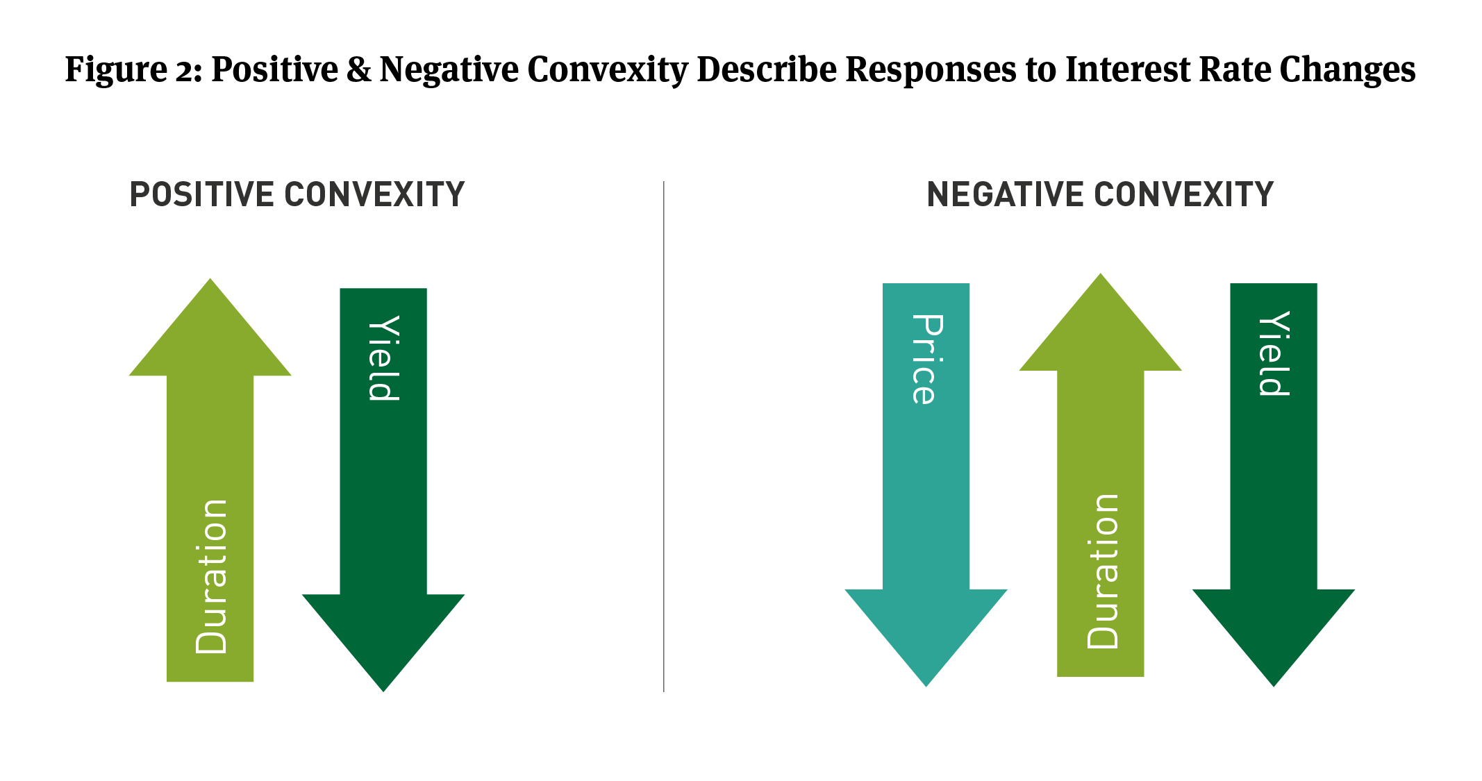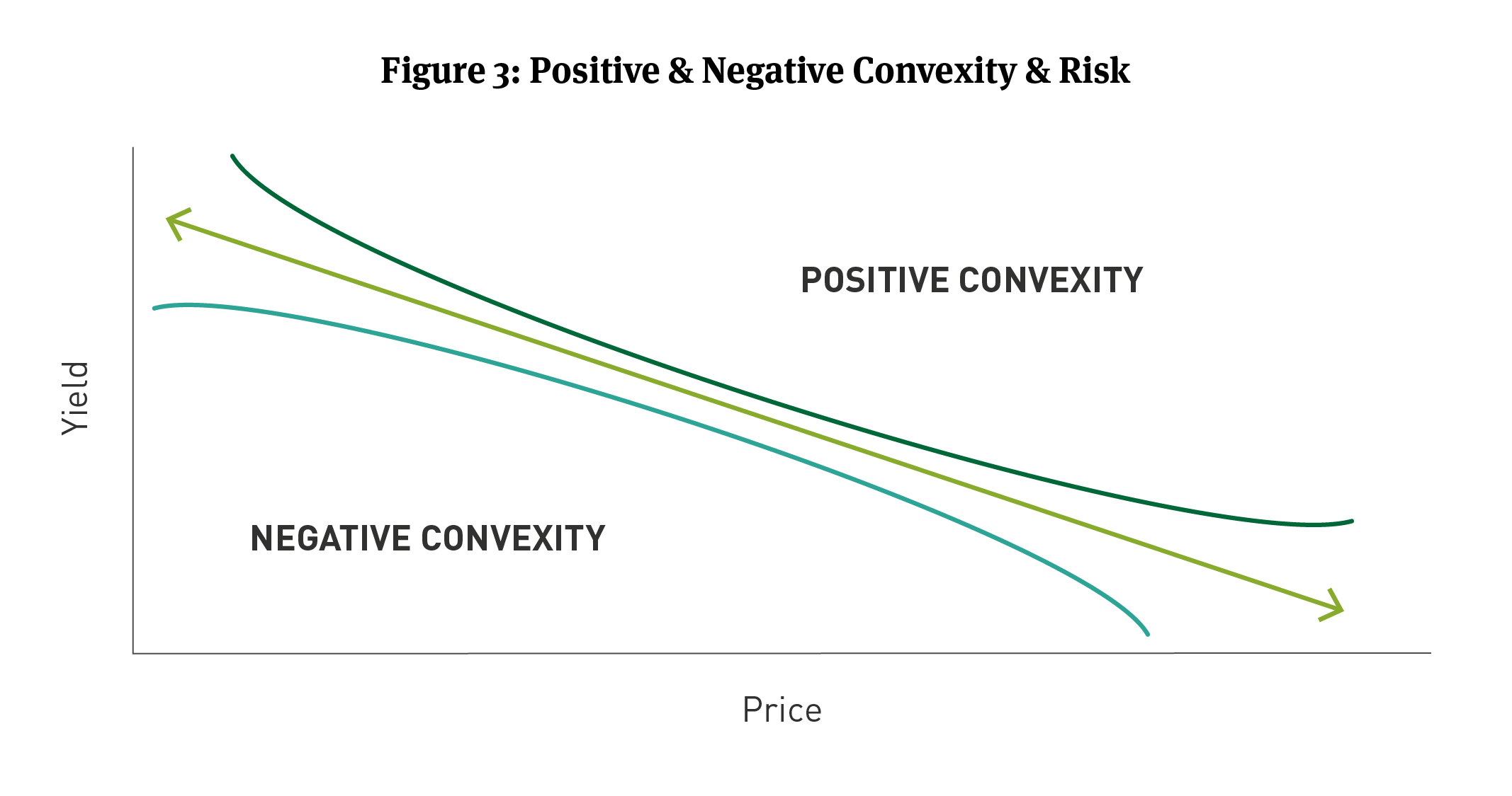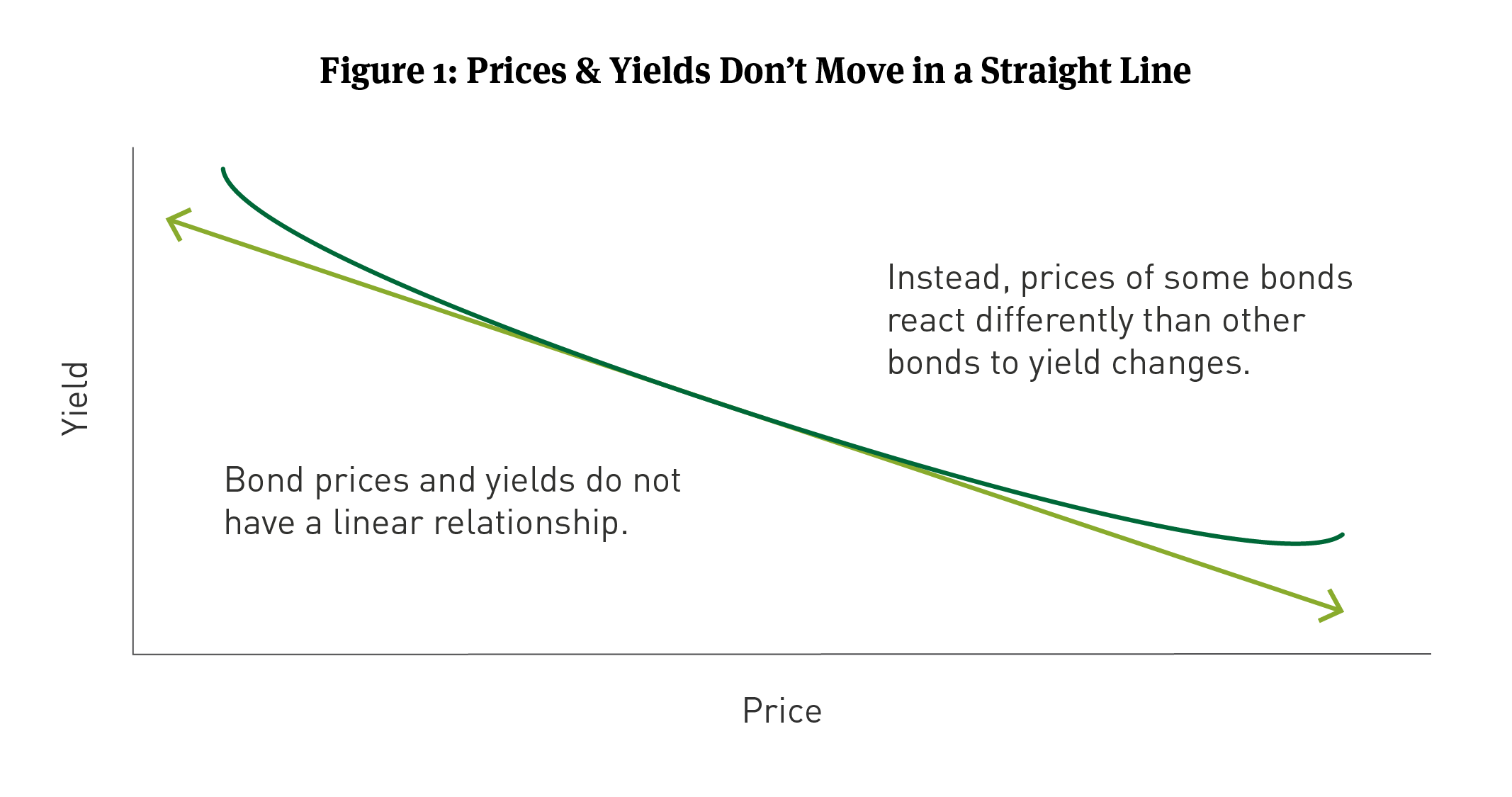 Instead, as yields rise or fall, the pace and size of any change in one bond’s prices can be different than another bond. That is duration and it can apply to all types of bonds including taxable, tax-exempt, and securitized bonds. Duration can be used to measure how sensitive the price of a bond is for a given change in interest rates. Visualizing price changes as yields change looks more like a curved line than a straight line (See Figure 1). The curved line illustrates a bond’s convexity. which can be thought of as a second derivative of the relationship between a bond’s price and its yield.