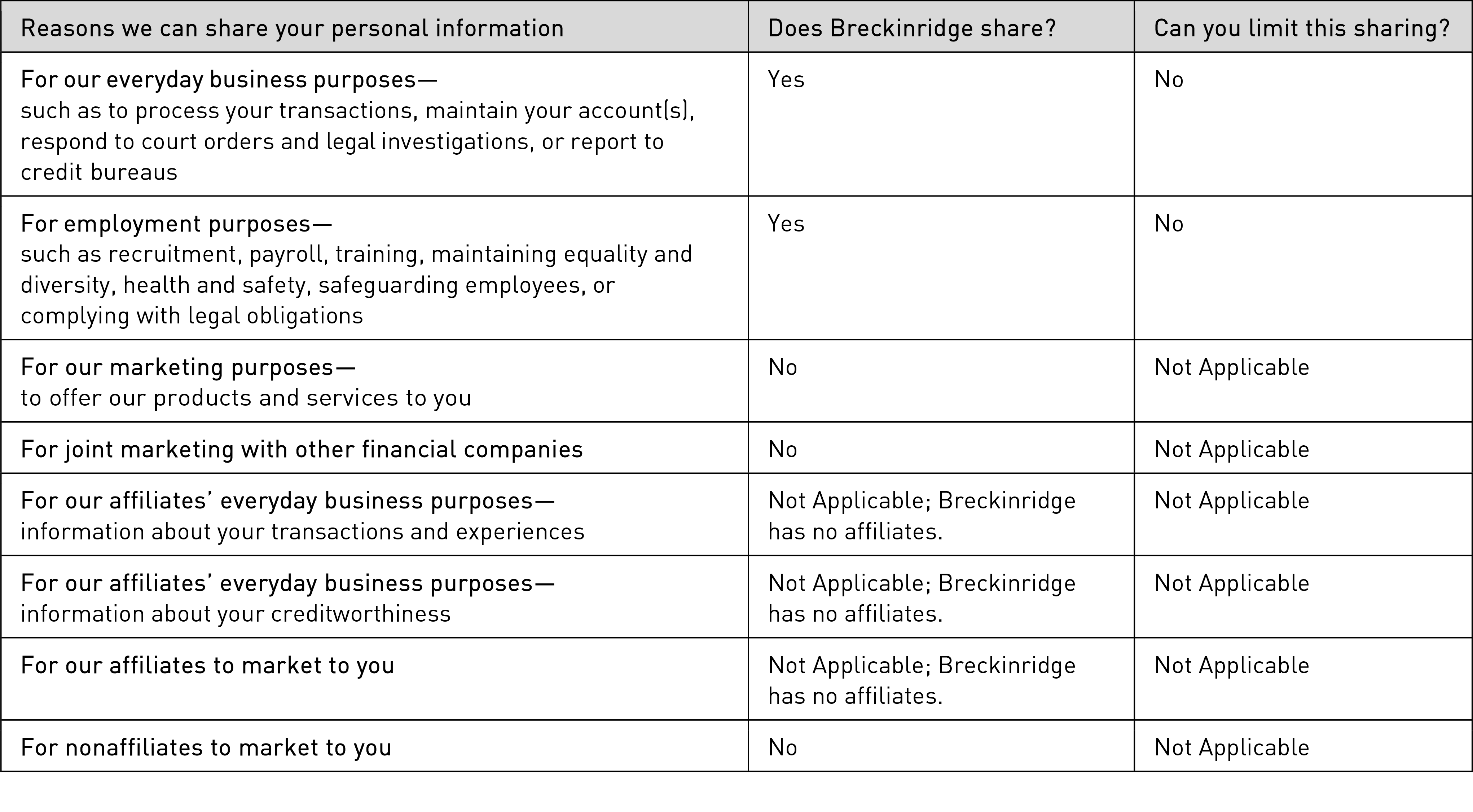 All financial companies need to share personal information to run their everyday business. In the section below, we list the reasons financial companies can share personal information; the reasons Breckinridge chooses to share; and whether you can limit this sharing.